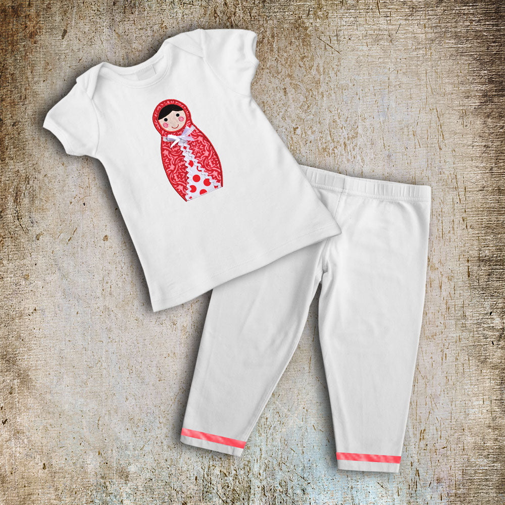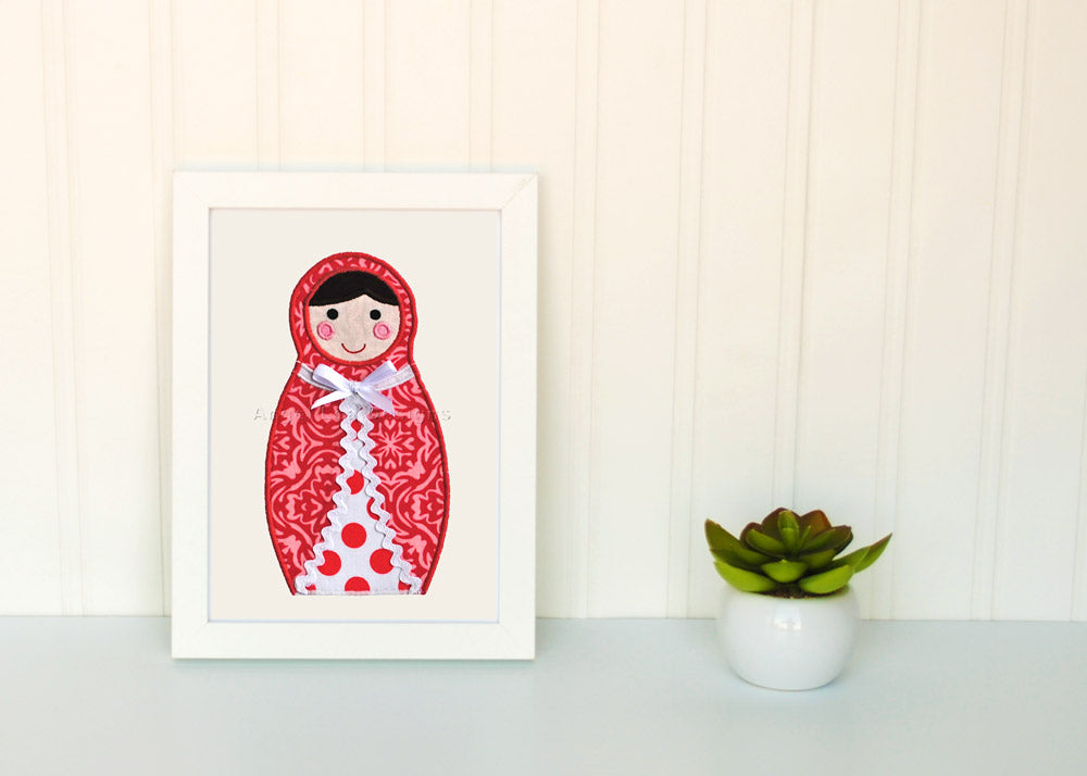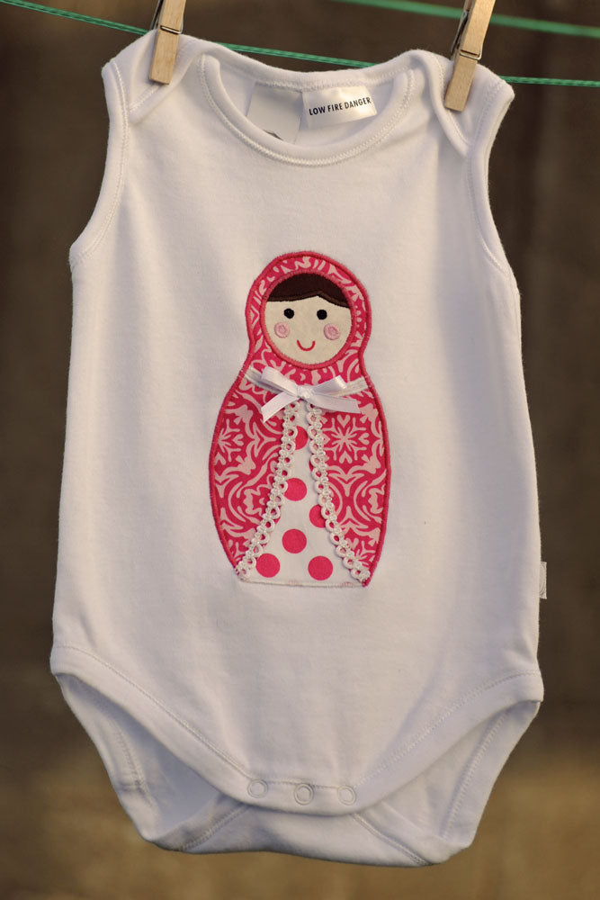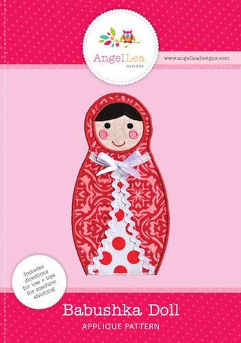 This babushka doll applique pattern is designed for making raw edge fusible-web appliques. The mouth will need to be embroidered onto the design, or alternatively, drawn on with fabric marker.