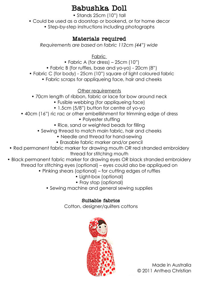 BABUSHKA DOLL PATTERN INCLUDES: