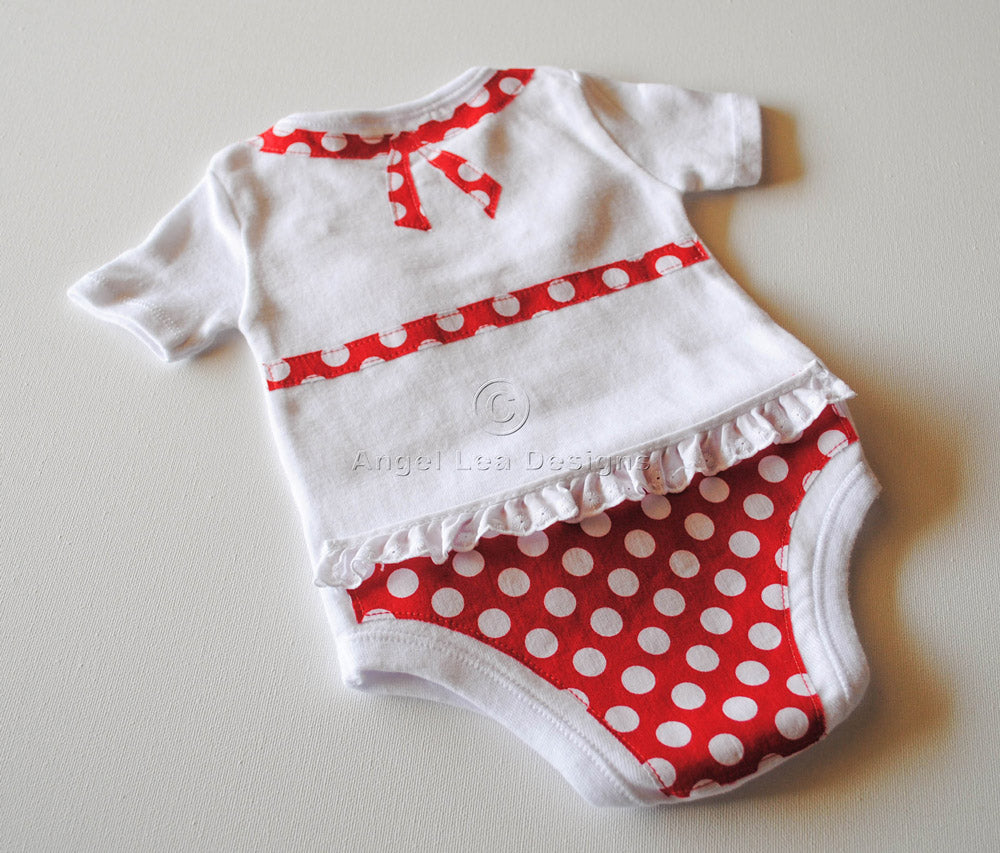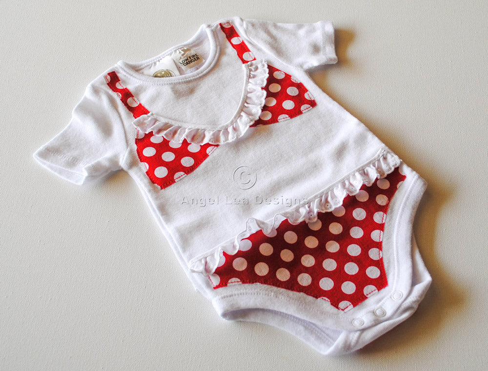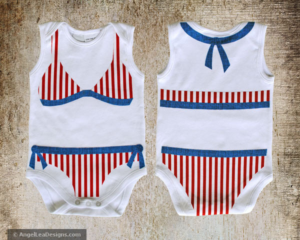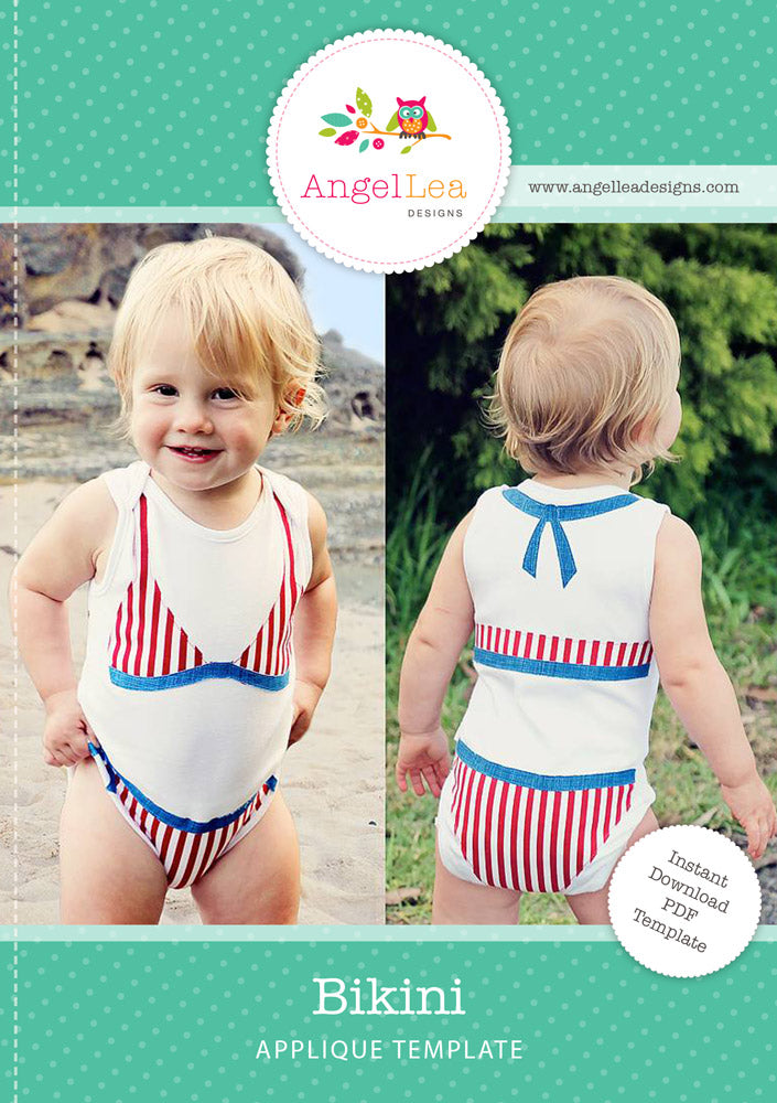 This bikini applique pattern is designed for making raw edge fusible-web appliques. The template is sized to fit approximately a 12 month size bodysuit. The template can be enlarged or reduced if required.