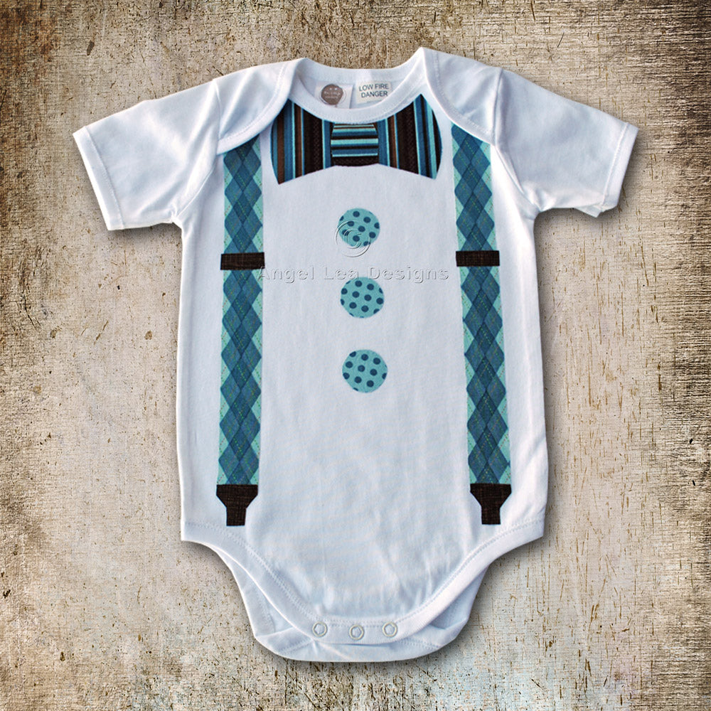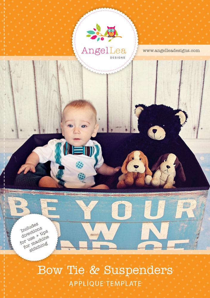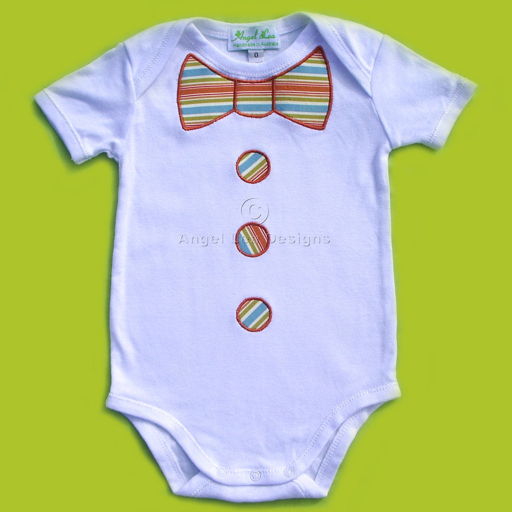 This bow tie and suspenders applique pattern is designed for making raw edge fusible-web appliques to embellish a baby bodysuit/onesie.