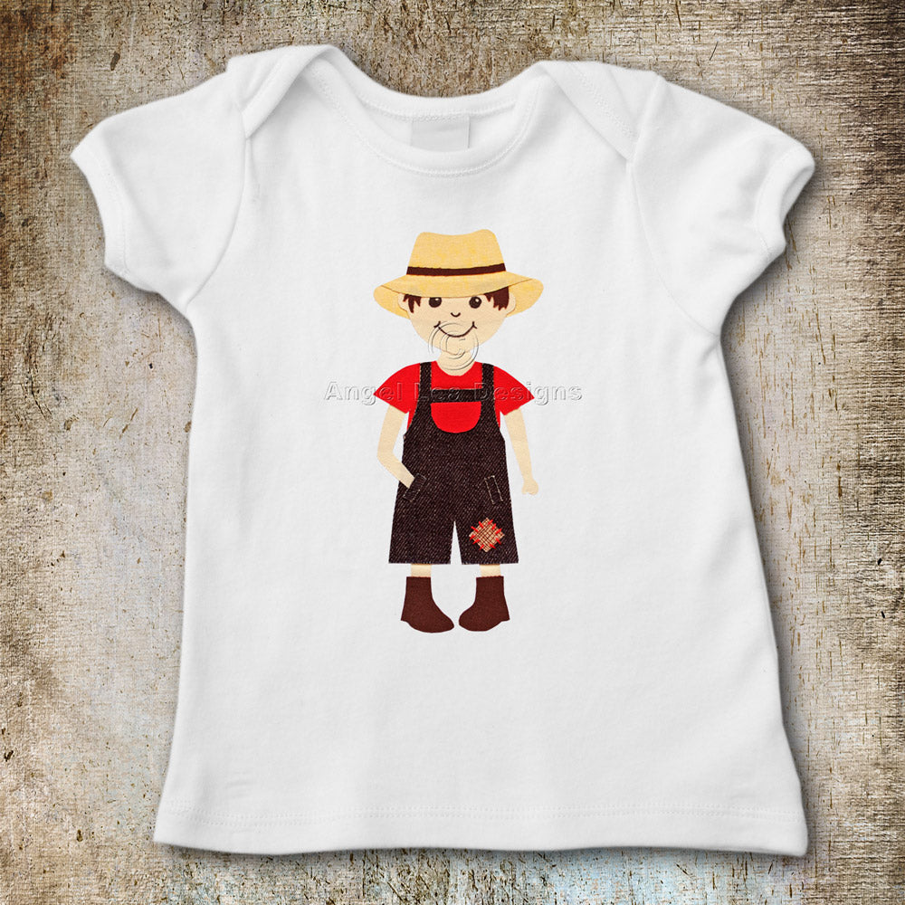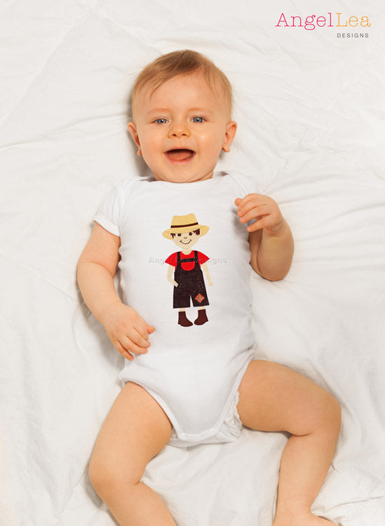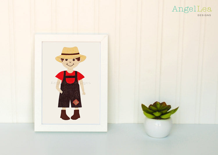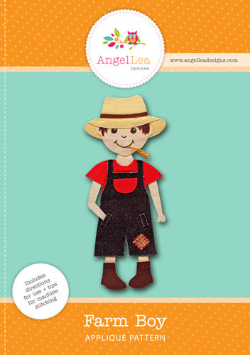 This farm boy applique pattern is designed for making raw edge fusible-web appliques. Some of the details need to be embroidered on the design, or alternatively, drawn on with fabric marker.
