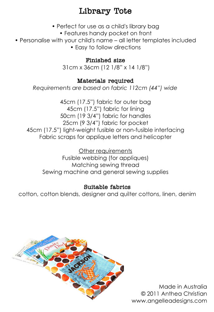 Child’s personalised tote bag pattern. Great for use as a library book bag for kindergarten or school. Could also be used for many other things such as carrying music to music lessons, toys and treasures, beach, travel, snacks, art supplies; it would also make a perfect gift for a child’s birthday.